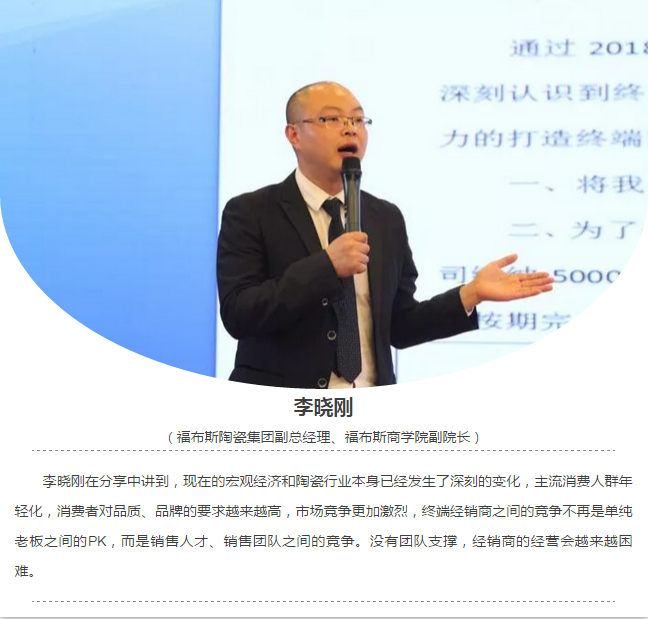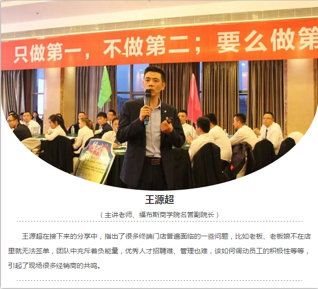 本次培训得到公司领导的高度重视,给予了大力支持。福布斯陶瓷副总经理李晓刚从宏观经济与行业发展趋势上分享了终端市场为什么要建团队以及建团队的基本条件!福布斯品牌讲师理张晓波则归纳了自己多年在终端市场的经验及具体操作方法,并毫无保留详细的分享给了参训的总裁学员们。
