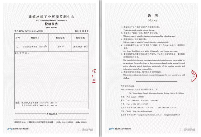 国家权威机构出具的负离子检测证书